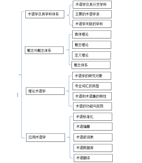接下来要解决的是术语的编排问题。术语词典可与语文词典相仿,采用按字母顺序排列条目。这种排列方式无法体现学科的知识体系,最佳的编排方式是按照术语的内容排序。前文提到的、与术语工作有关的国际标准、格里尼奥夫所编的《术语学术语历史系统词典》采用的是按照系统排序法,具体来说,它们以若干范畴为出发点,按照术语的内容来排列词条。本词典得条目也采用系统编排法,具体来说,是主题排序法。按照术语学的学科内容,首先划分出“术语学及其学科体系”“概念与概念体系”“理论术语学”“应用术语学”4个主题。主题在细化为子主题,子主题内部的术语按照称谓的概念内容进行聚类,建立若干术语场术语场或子场内部的术语则按照概念层级关系分类。本词典中包含的主题如下图所示: