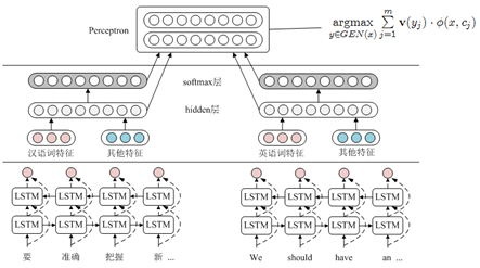 术语抽取和对齐利用基本篇章单元分析结果。首先实现了汉语术语抽取,该任务是一个典型的序列标注任务,采用双向LSTM神经网络模型建立模型。在前期工作中,已根据《常用政治名词术语词典》、《汉英中国政治术语词典》等词典中的汉语及英语政治术语建立了一个术语集合,并在政府工作报告、人民日报中英文版、环球时报中英文版等资源中搜索包含该词的句子,以此构建了一个术语抽取的训练集,训练集中的每个实例包含一个汉语及英语的政治术语对,以及包含该词的句子。这一数据作为模型的训练数据。在对齐阶段,利用一致度进行对齐,仍然采用图1所示的对齐分析系统。
