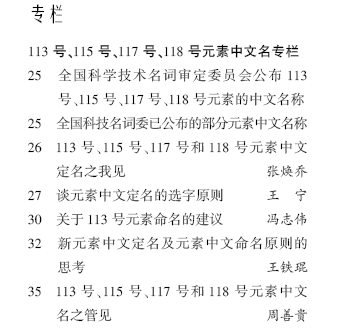 全国科技名词委主办的专业期刊《中国科技术语》分别在2016年第六期和2017年第二期,以专栏形式对四个元素定名背景、定名过程、专家意见等给予详细论述。专栏稿件汇集了张焕乔、王宁、冯志伟、王铁琨、周善贵、王颖霞、才磊等众多专家的研究成果,全面向读者介绍了此次新元素中文定名工作的来龙去脉。