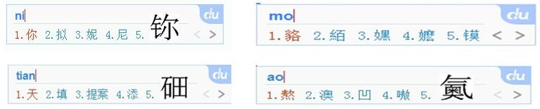 事务中心信息化主管杜振雷制作了四个元素中文名称的高清图片,与百度输入法事业部合作,通过图片与拼音关联的方法,变相实现了四个元素中文名称的输入法,方便社会使用,直到ISO/IEC 10646的区位码和字符集中实现后替换为标准格式。