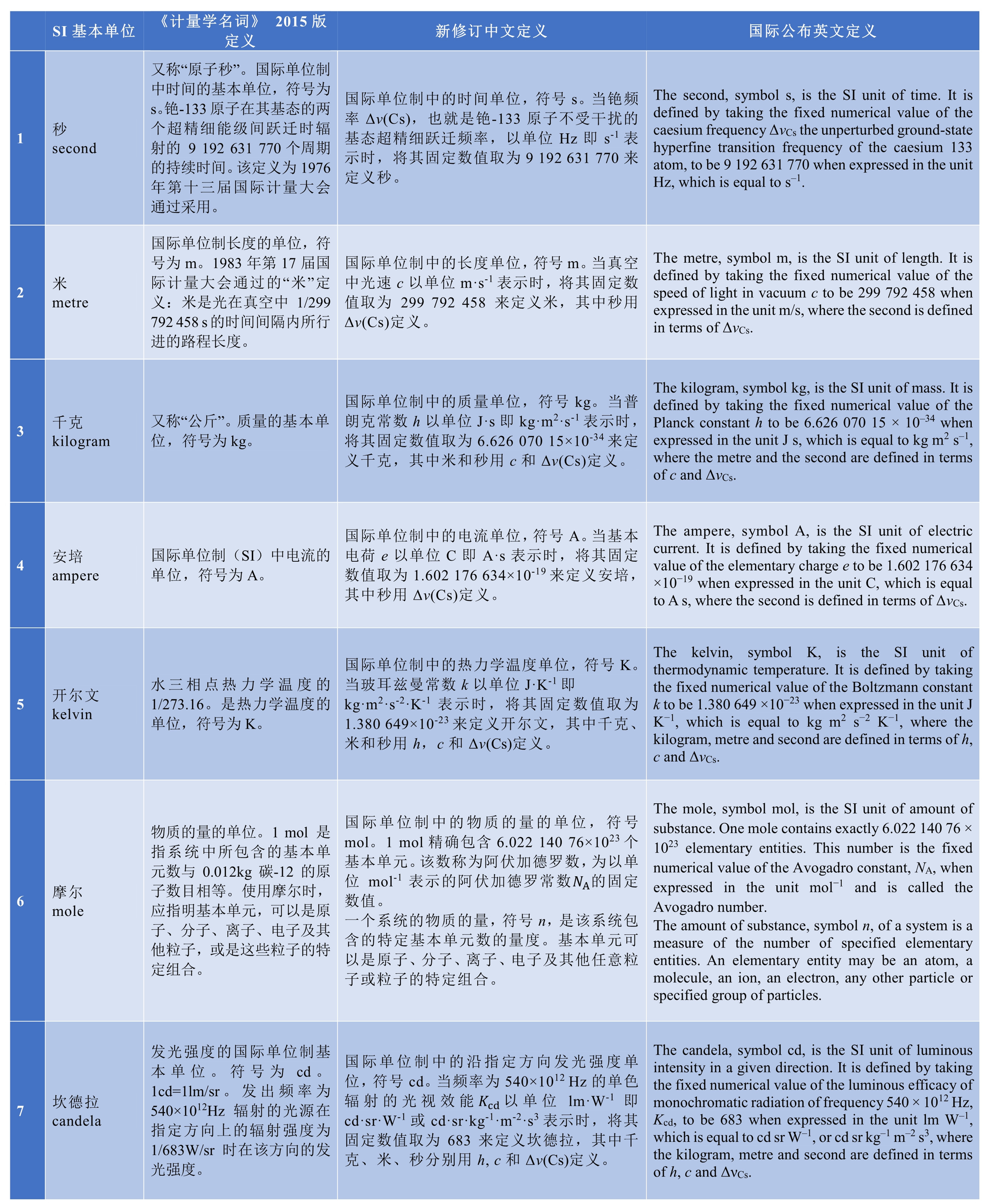 对国际单位制7个基本单位的中文定义的修订是我国科学技术研究中的一个重要活动,对于促进我国科技交流、支撑科技创新具有重要意义。