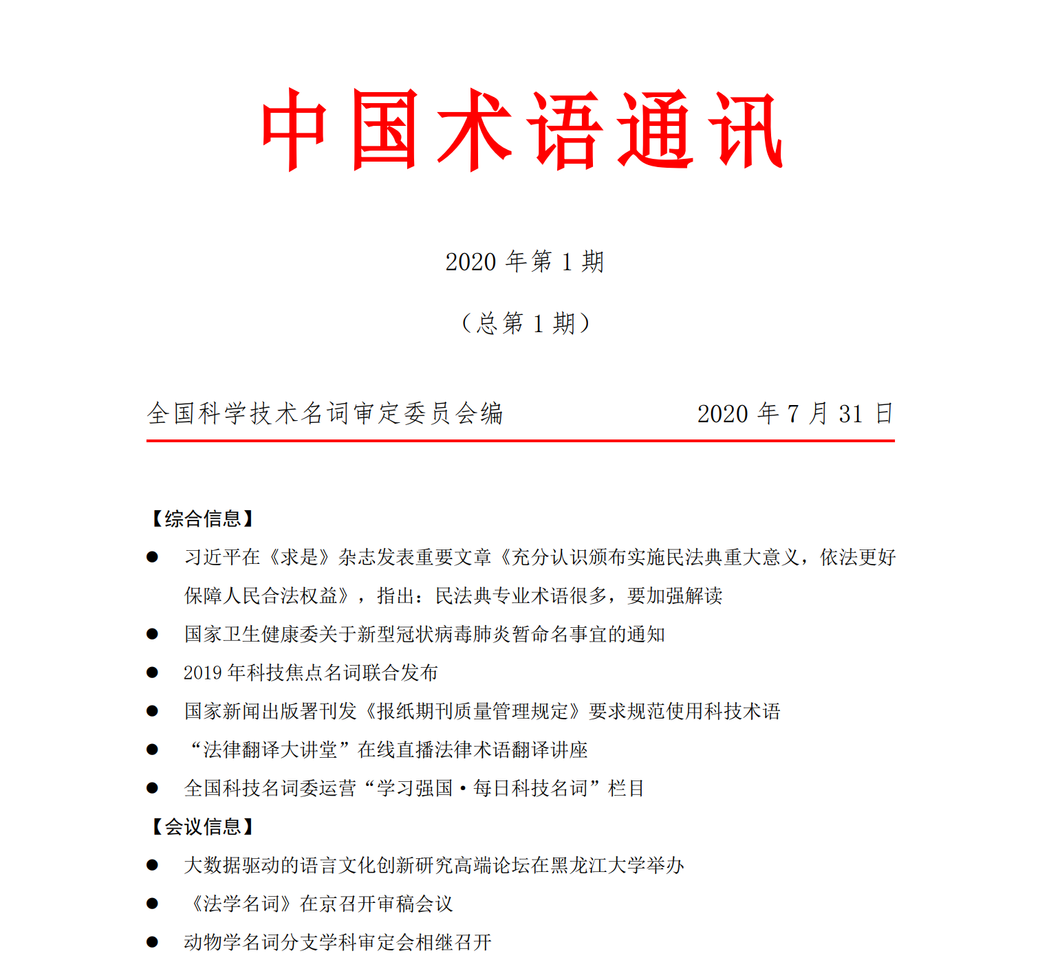 随着我国术语实践工作的不断发展,我国术语理论研究不断深入,研究成果也日见丰硕。为建立信息沟通机制,增进术语交流与合作,共享研究成果信息,推动学术资源的优化配置,凝聚术语研究力量,全国科技名词委决定于2020年起不定期地组织编订工作资料《中国术语通讯》,力争全面地汇集和整理中国术语事业发展动态和信息,及时提供给各位专家学者参阅。《中国术语通讯》2020年第1期汇集了1-6月术语信息。