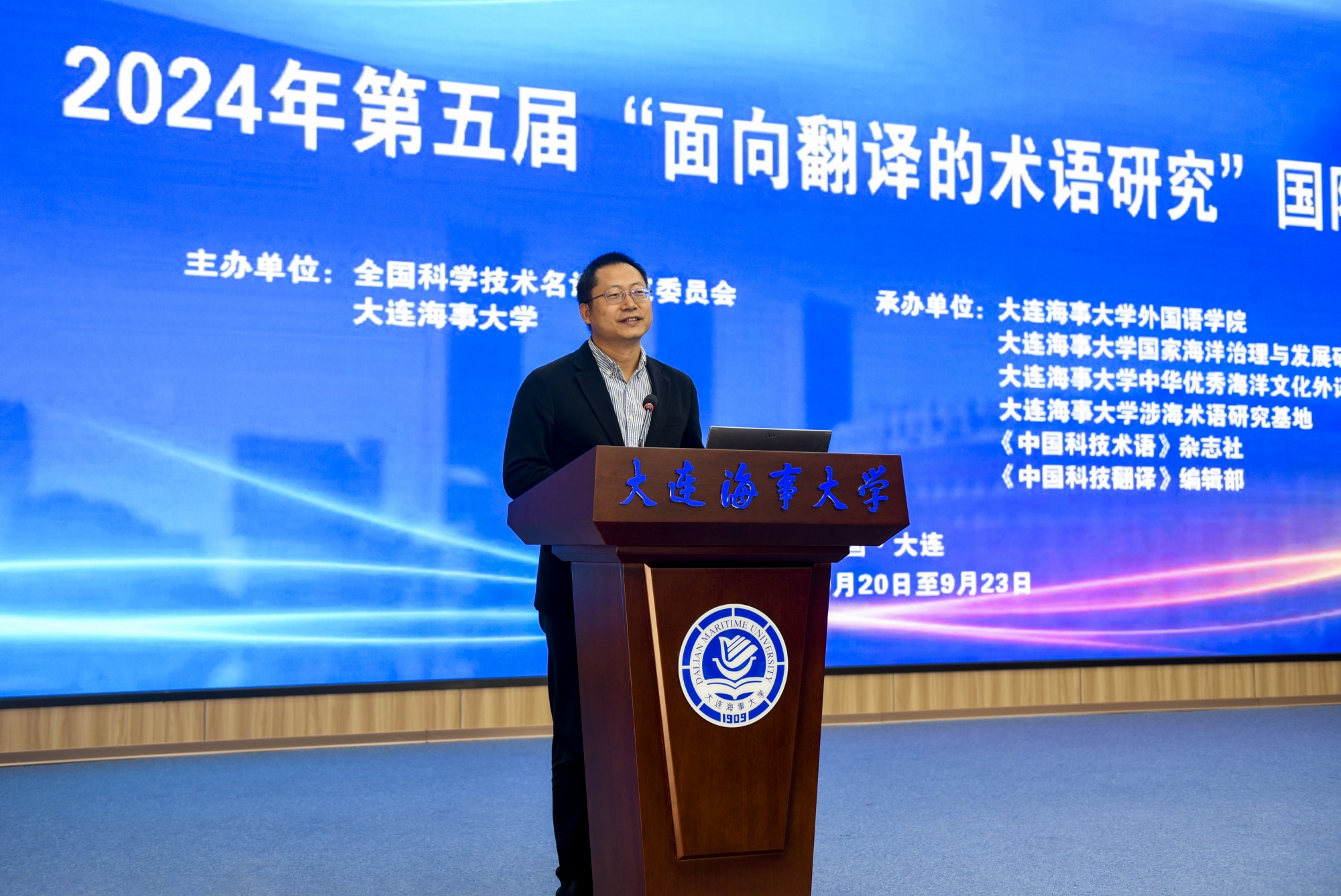 赵宝刚向与会嘉宾简要介绍了大连海事大学的办学背景和近年在教学科研上取得的进展。大连海事大学是交通运输部所属唯一高校,是海事领域唯一的国家“双一流”建设高校,近年在海上通信和智能船舶等关键领域、重点实验室建设、人才培养改革等方面取得了一系列重要进展。海大外国语学院是学校一张亮丽的名片,近年在海事特色人才培养、海洋文化译介与传播、涉海术语研究等方面取得了瞩目成就。他指出,精准的术语翻译,是讲好中国故事、传播好中国声音的基础,希望能够通过本届大会,汇聚各方智慧,共同探索术语研究的新领域、新方法,为推动全球术语研究贡献中国智慧。