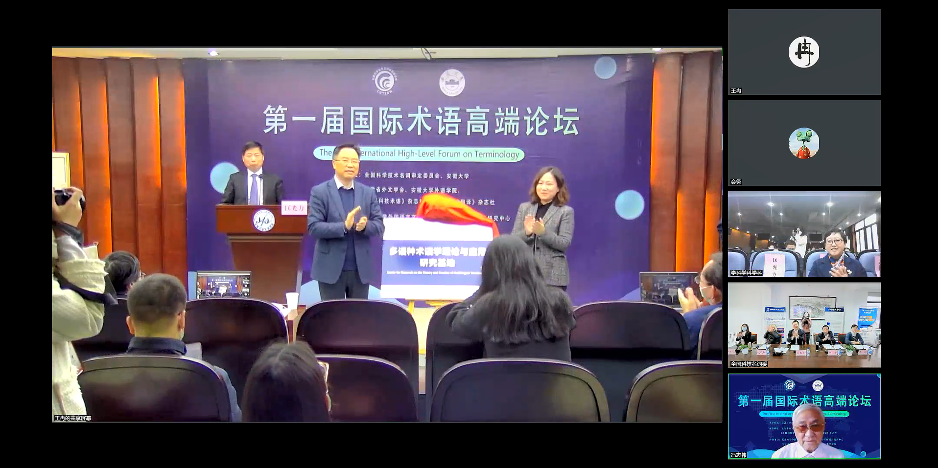 11月19—20日,由全国科技名词委与安徽大学联合主办,安徽省外国语言文学学会、安徽大学外语学院、《中国科技术语》杂志社、《中国科技翻译》杂志社承办,复旦大学外国语言文学学院、南京大学双语词典研究中心、北京语言大学文献语言研究所、西南大学文学院联合协办的第一届国际术语高端论坛顺利召开,会议以线上线下相结合方式进行。全国科技名词委专职副主任裴亚军、安徽大学校长匡光力等领导、专家出席开幕式。
