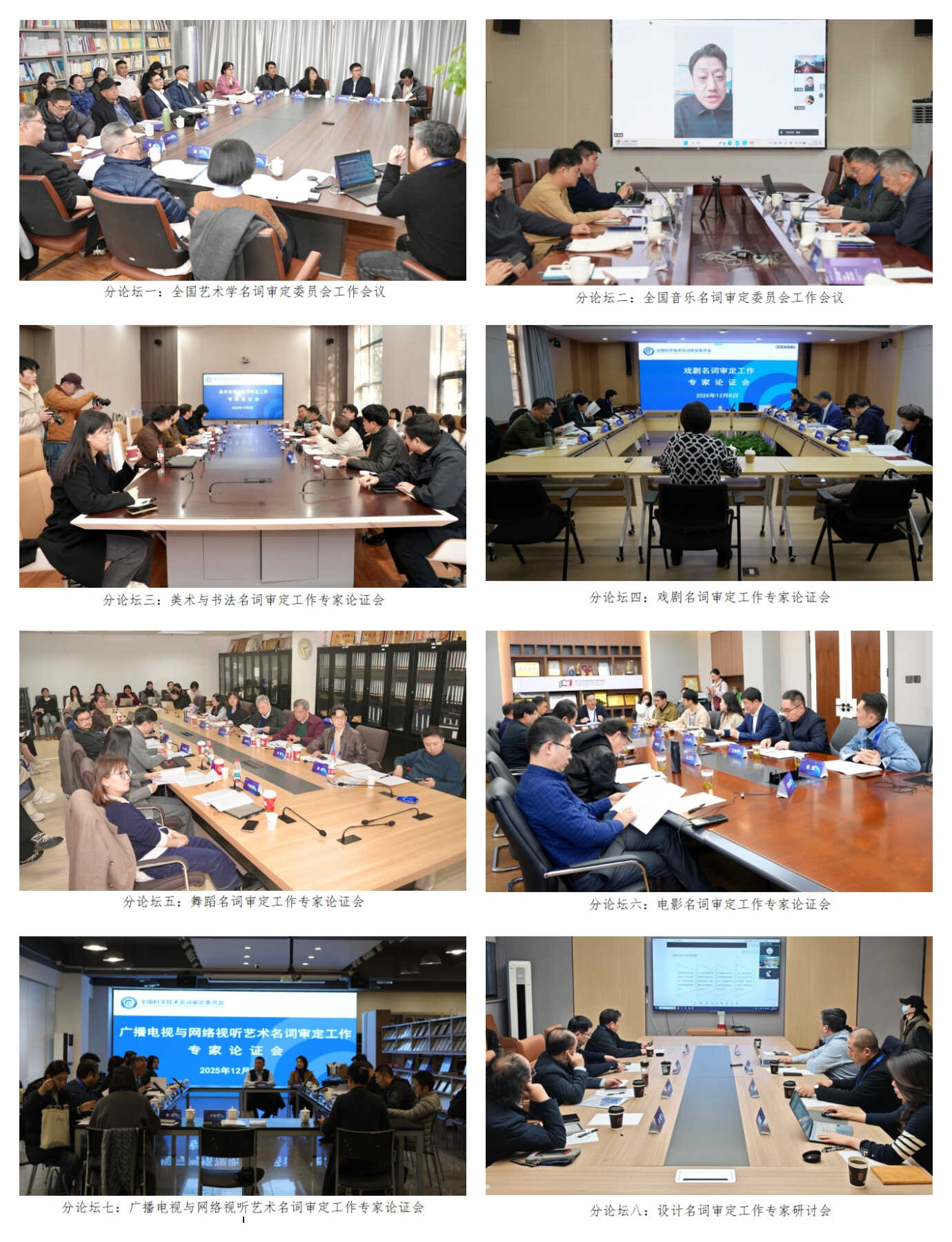 当天下午,论坛进入分论坛阶段。八个平行分论坛同步举行,涵盖艺术学理论、音乐、美术与书法、戏剧、舞蹈、电影、广播电视与网络视听艺术、设计等艺术学主要领域。各分论坛均由全国科技名词审定委员会及相关领域专委会牵头单位主办,由国内顶尖艺术院校具体承办:包括由南京艺术学院承办的艺术学理论分论坛(全国艺术学名词审定委员会工作会议)、由中国音乐学院承办的音乐分论坛(全国音乐名词审定委员会工作会议)、由中央美术学院承办的美术与书法分论坛(美术与书法名词审定工作专家论证会)、由上海戏剧学院承办的戏剧分论坛(戏剧名词审定工作专家论证会)、由北京舞蹈学院承办的舞蹈分论坛(舞蹈名词审定工作专家论证会)、由北京电影学院承办的电影分论坛(电影名词审定工作专家论证会)、由中国传媒大学承办的广播电视与网络视听艺术分论坛(广播电视与网络视听艺术名词审定工作专家论证会),以及由清华大学美术学院承办的设计分论坛(设计名词审定工作研讨会)。
