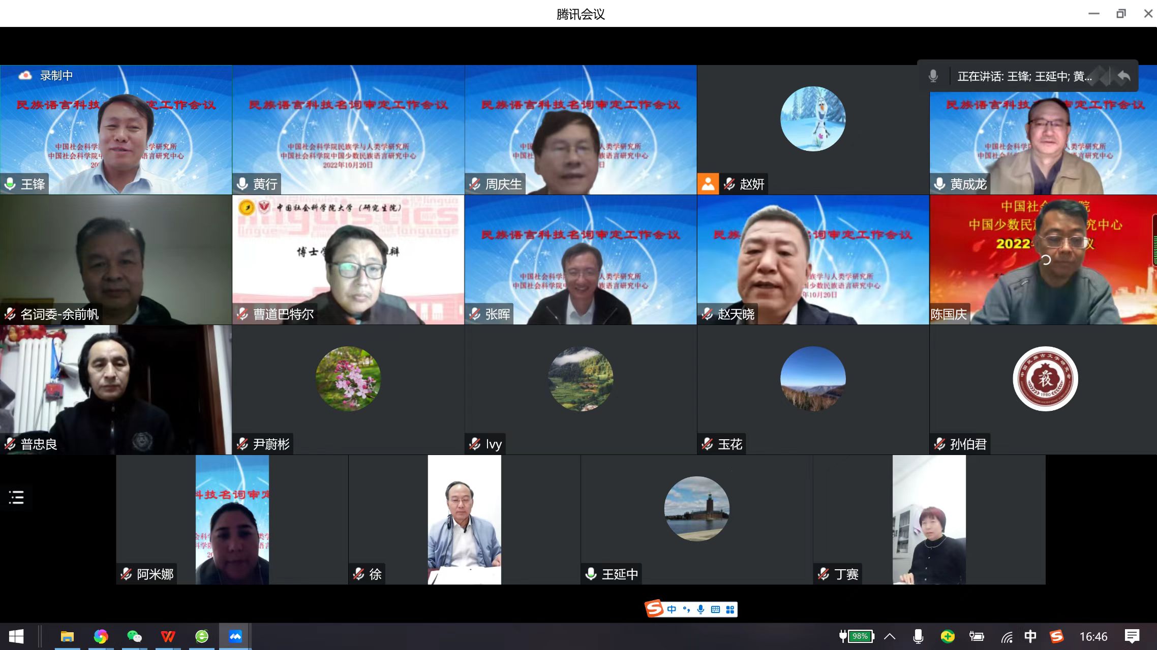 2022年10月20日,民族学与文化学名词委民族语言名词审定工作会议在线上召开,民族学与人类学研究所赵天晓书记、王延中所长、徐文华副所长、丁赛副所长、王锋副所长,以及黄行研究员、周庆生研究员、黄成龙研究员等民族语言学科的部分专家学者出席会议。全国科技名词委事务中心张晖副主任、项目主管余前帆参加会议。会议由王锋主持。