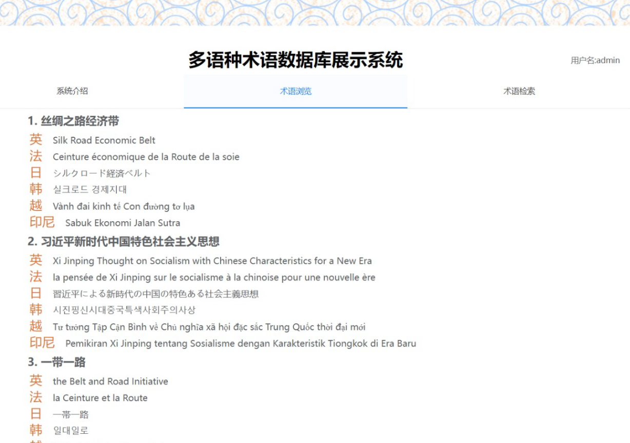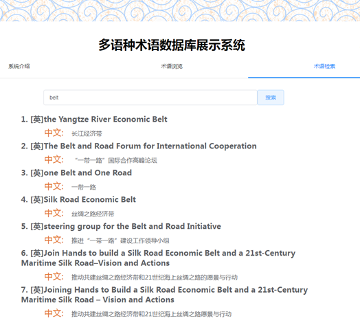 (3)政治领域多语种术语数据库展示系统。本项目建立了一个多语种术语数据库展示系统,数据来源于已抽取的政治领域多语种术语对。