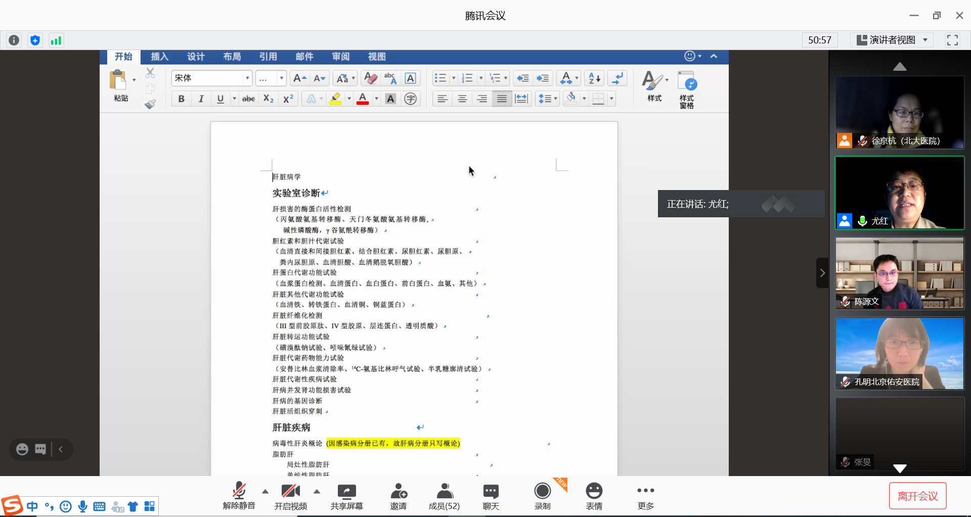 2020年11月22日,肝病学名词审定委员会召开线上审定工作启动会。中华医学会肝病学分会主任委员、肝病学名词审定委员会主任委员徐小元,北京友谊医院副院长、肝病学名词编写委员会主编尤红,以及南月敏、亚朦、徐京杭、陈源文、福军亮、李灵、孔明、彭虹、王荣琦、张旻、李伟、张玉果、刘嘉、梁红霞、张翀、雷宇、黄祖雄、李婉玉、杨辉、乔蓓、王璐、朱庆峰、曹海芳、唐映梅、杨慧、丁洋、万裴琦、陈立、王杰、蔡晓波等50余位来自全国各地的肝病学专家,医学名词审定委员会秘书长张玉森,全国科技名词委医学专项办项目主管商涛等人参加会议。会议由尤红主持。
