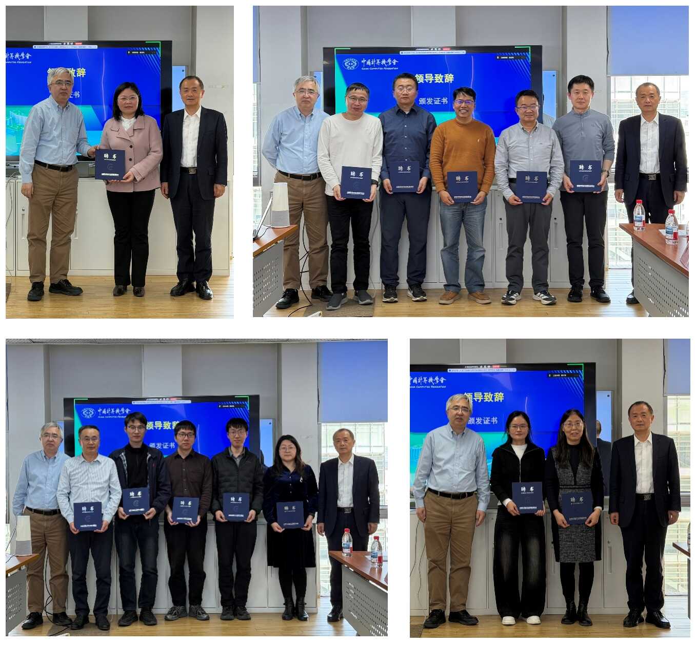 计算机名词委副秘书长韩飞编审主持补发聘书环节。刘金婷处长宣读了编写委员会委员名单。梅宏院士向陈熙霖研究员颁发主编聘书,之后梅宏院士和陈熙霖研究员向副主编、编写委员会委员、秘书长、秘书等颁发聘书。