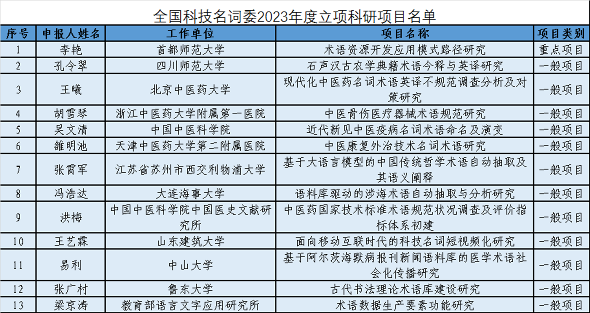 根据《全国科技名词委科研项目管理办法》,现将全国科技名词委2023年度科研项目名单予以公示,公示时间为2023年11月1日—11月5日。公示期内,如有异议,请与我处联系。