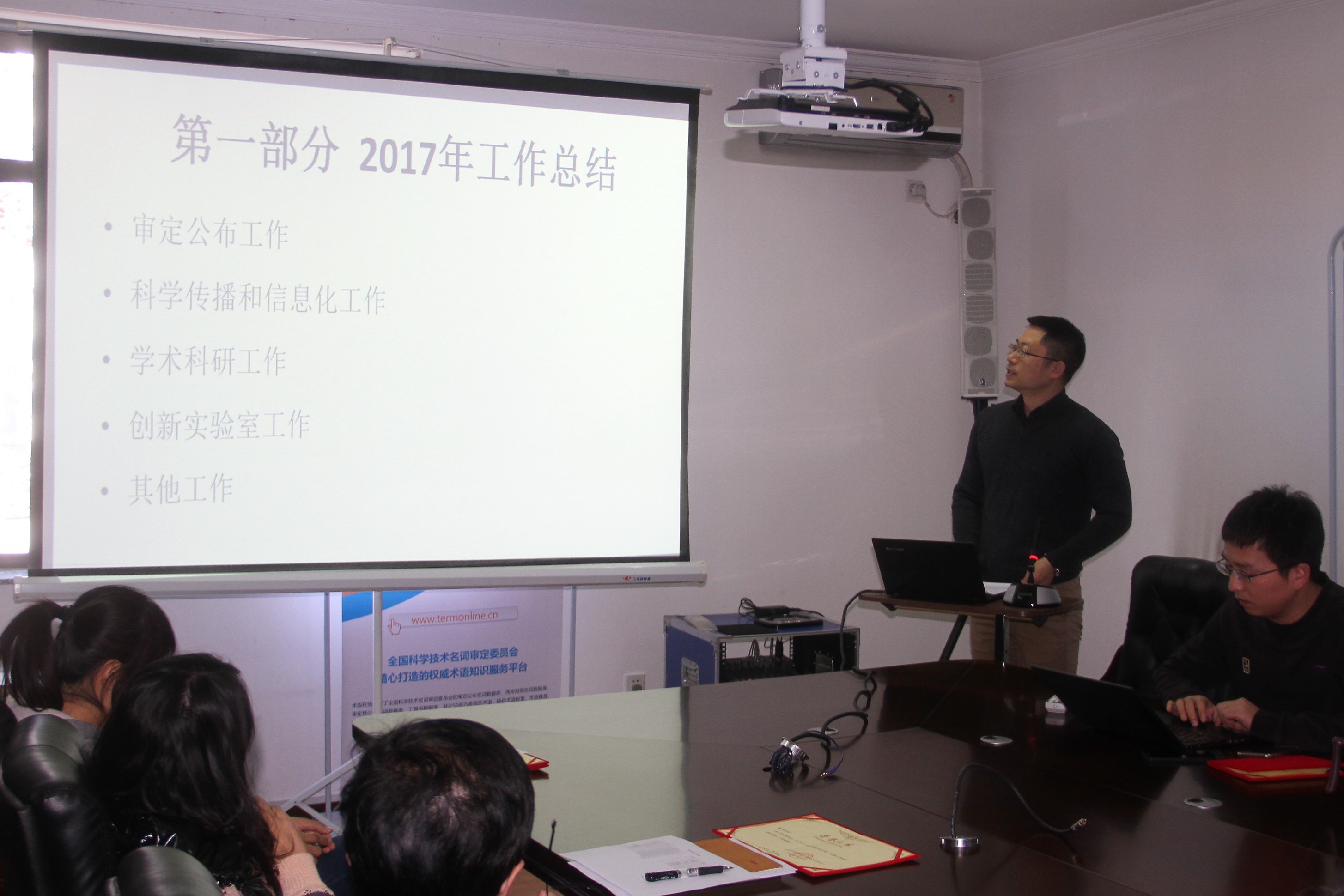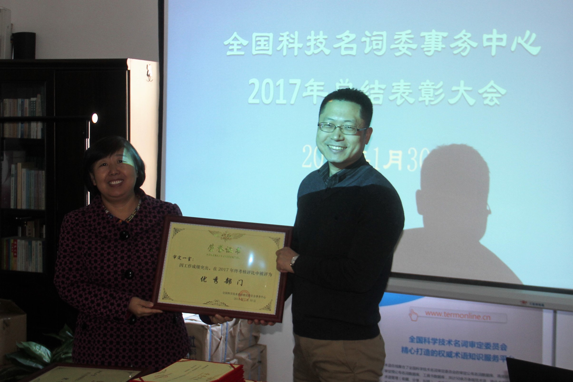 2018年1月30日,全国科技名词委事务中心召开了2017年度工作总结表彰大会。事务中心全体员工参加了会议。全国科学技术名词审定委员会专职副主任、事务中心主任裴亚军总结了2017年事务中心在科技名词审定、科学传播与信息化、学术科研、创新实验室等方面所取得的工作成果和亟待解决的不足之处,并对在过去一年当中做出突出贡献的部门和个人进行表彰,以资鼓励。