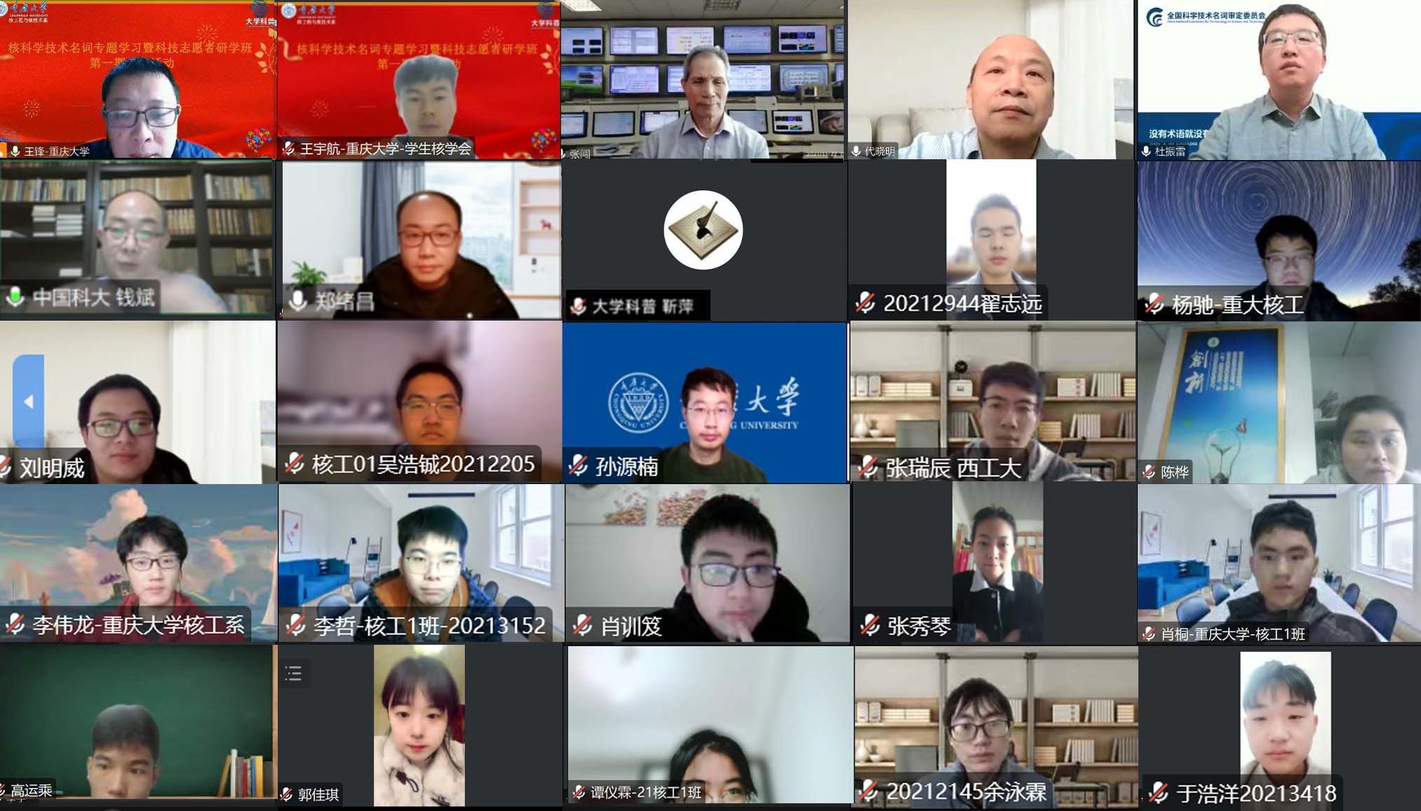 2023年1月13日,全国科学技术名词审定委员会事务中心、《大学科普》杂志社、重庆大学核工程与核技术系联合以线上直播的方式成功举办了核科学技术名词专题学习暨科技志愿者研学班。为期一天的培训,紧凑且高水准的完成了此次教学方案制定的全部教学任务。来自重庆大学、重庆市大学科学传播研究会、清华大学、浙江大学、西北工业大、陕西师范大学、兰州大学等13所院校及单位,共计50余名师生参加本期培训活动。