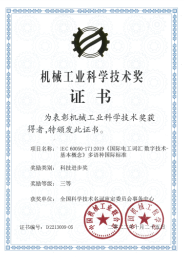由全国科技名词委事务中心和中机生产力促进中心有限公司、中国信息通信研究院、华能江苏能源开发有限公司、南方电网科学研究院有限责任公司等相关单位承担的“IEC 60050-171:2019《国际电工词汇 数字技术-基本概念》多语种国际标准”项目获“机械工业科学技术奖”2022年度科技进步三等奖。