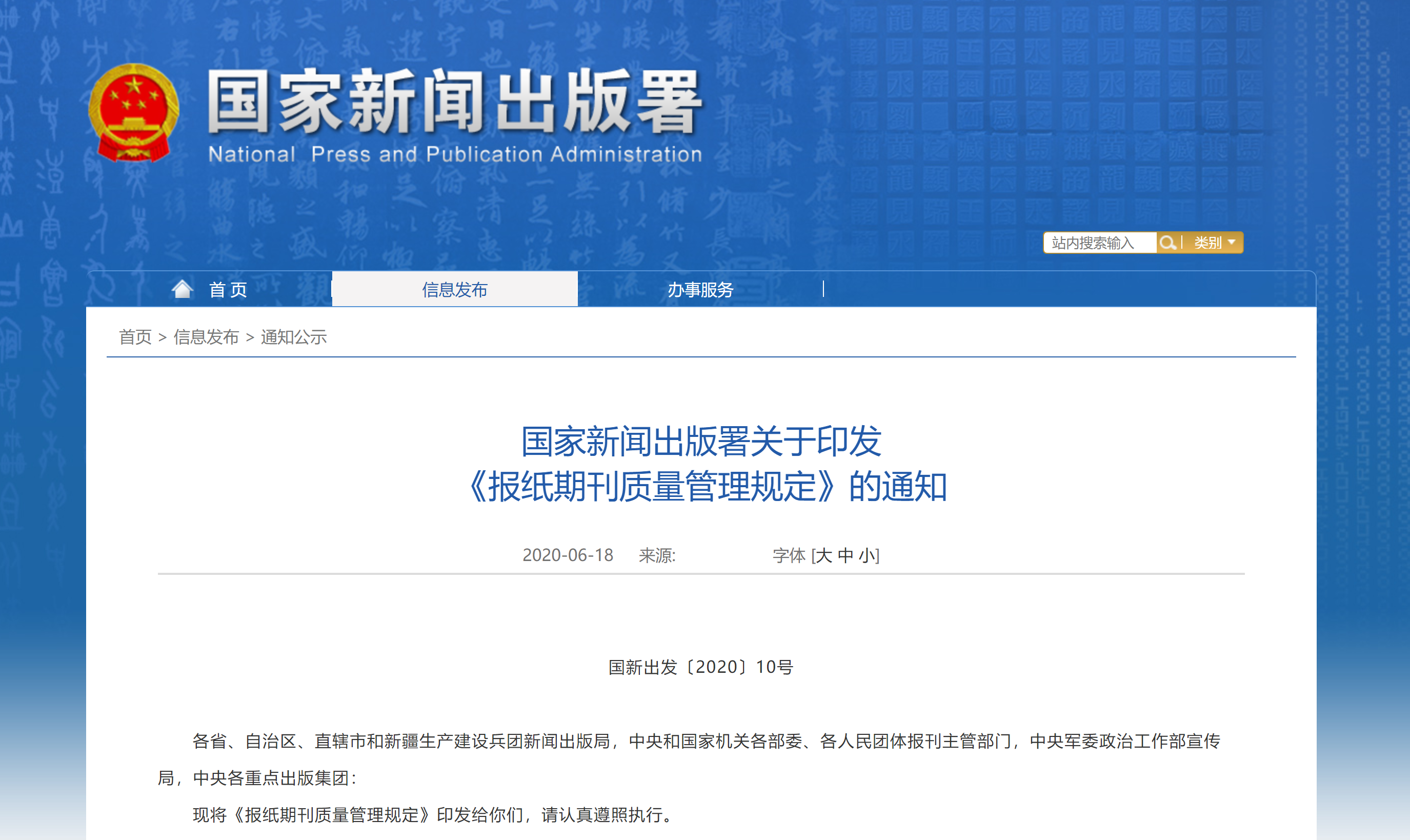 6月18日,国家新闻出版署官网发布《关于印发<报纸期刊质量管理规定>的通知》,并正式刊发《报纸期刊质量管理规定》,明确要求规范使用科技术语。