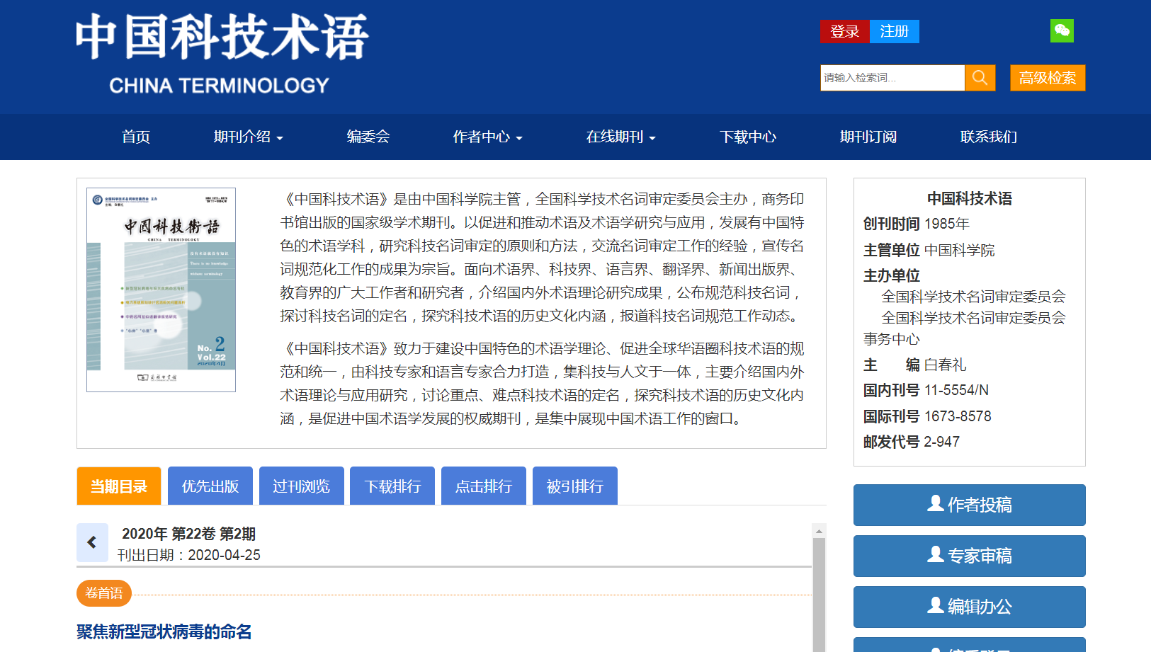 为方便服务读者、作者、编者及相关专家,提高工作效率和提升期刊影响力,2020年6月24日,《中国科技术语》正式启用新版门户网站。新版门户网站采用了全新的功能设计和页面设计,建立了一个与作者互动、为读者提供服务和主动宣传的基础...