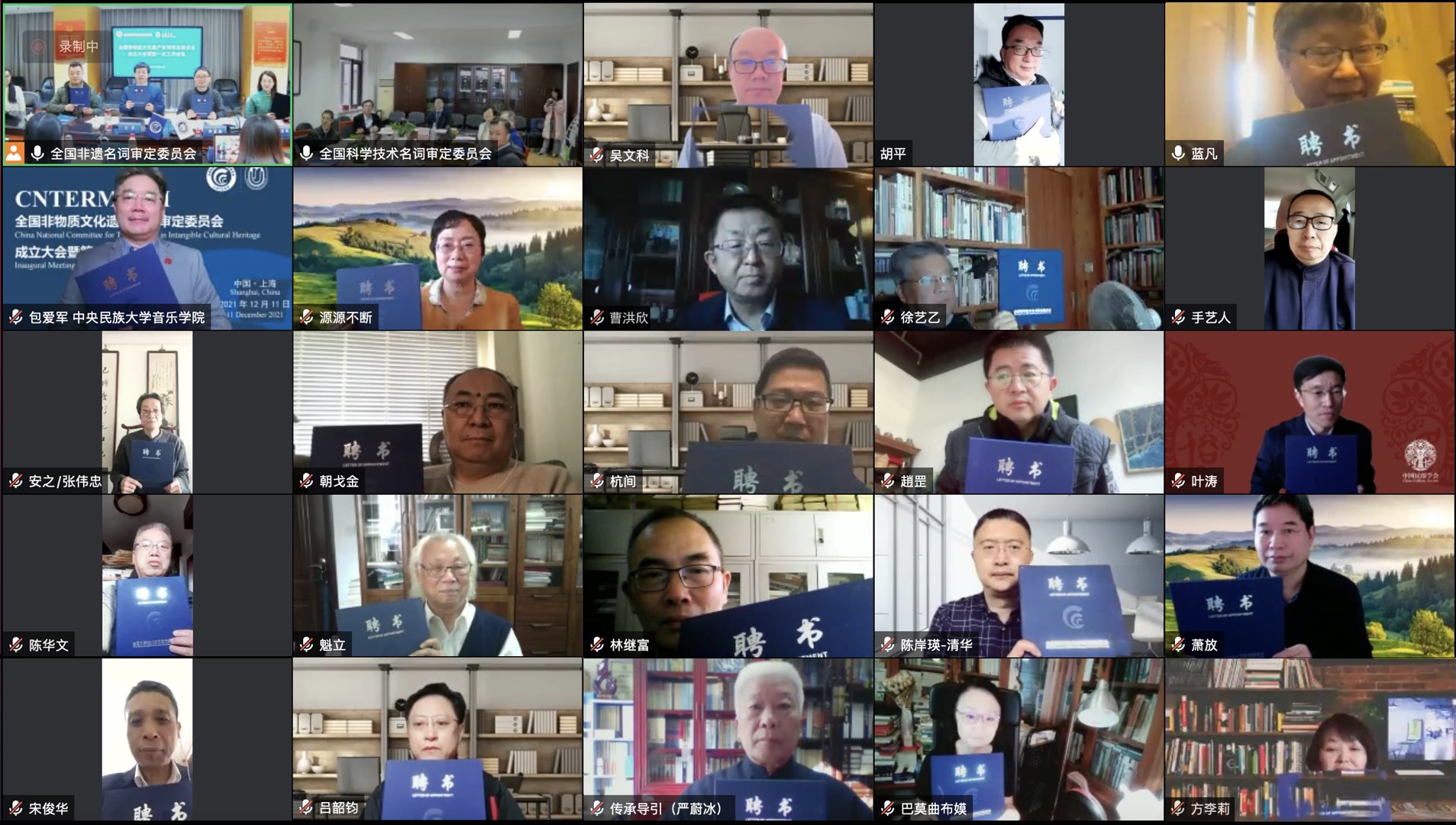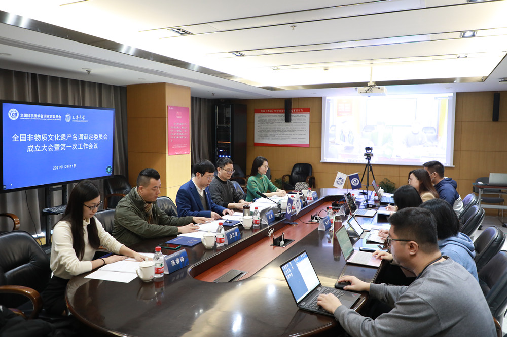 2021年12月11日,由全国科学技术名词审定委员会授权成立的全国非物质文化遗产名词审定委员会成立大会暨第一次工作会议在线上召开。全国科技名词委专职副主任裴亚军,文化和旅游部原副部长、党组成员项兆伦,中国社会科学院荣誉学部委员刘魁立,上海大学党委副书记段勇,中国社会科学院学部委员、民族文学研究所所长朝戈金,中国文联副主席、中国民间文艺家协会主席潘鲁生,中国民俗学会会长、山东大学特聘教授叶涛,中国民间文艺家协会副主席、中国美术学院学术委员会副主任杭间,东南大学特聘首席教授、东南大学艺术人类学与社会学研究所所长方李莉,中国民俗学会副会长巴莫曲布嫫,全国科技名词委事务中心副主任张晖、审定三处处长温昌斌、首席专家邬江、项目主管叶艳玲、余前帆,以及上海大学黄景春、章莉莉、张睿锜等40余位专家委员和工作人员,来自中央和地区的新闻媒体代表参加了会议。