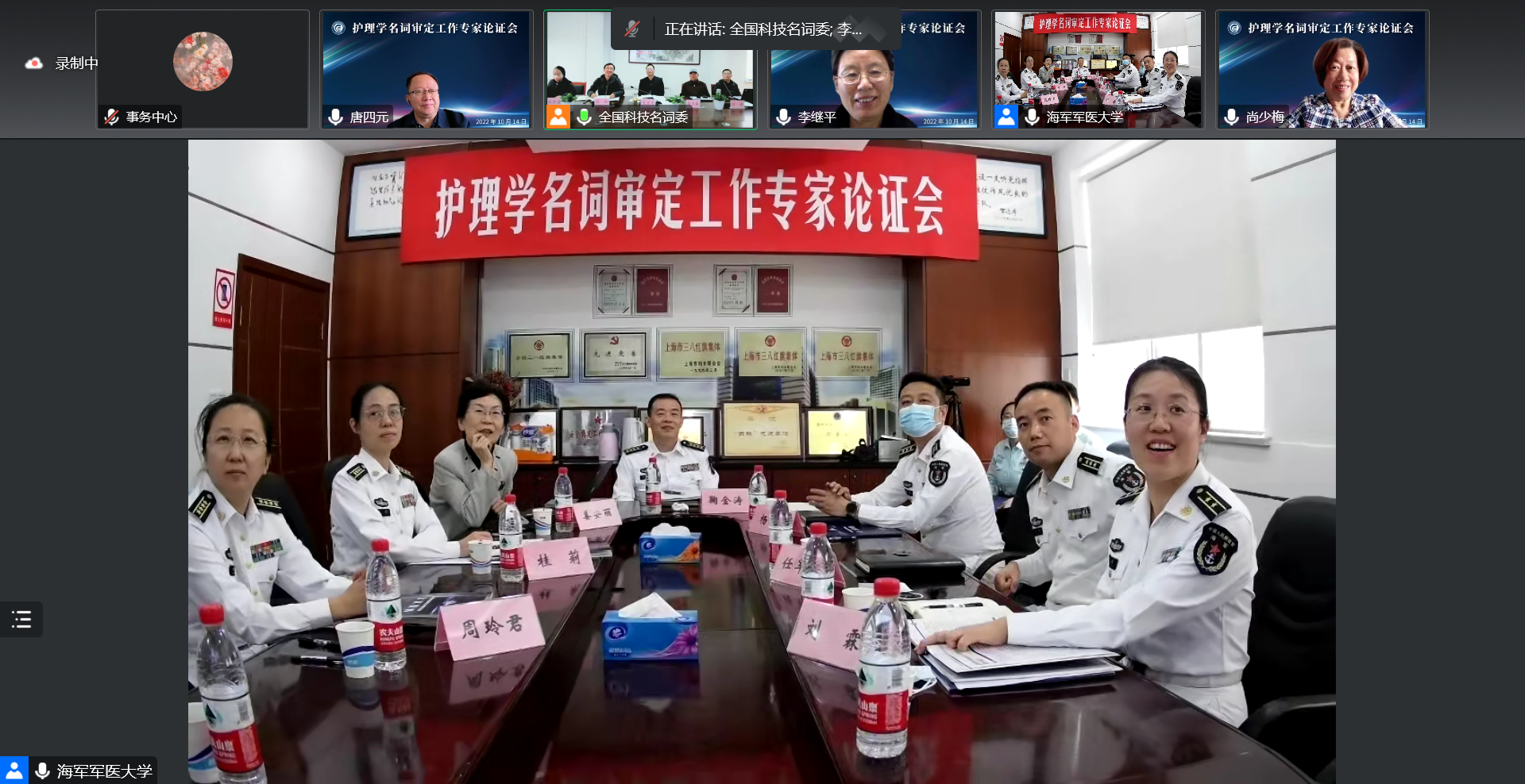 随后,尚少梅教授作为评审组长主持了评审环节的会议,与会评审专家逐一对有关报告和方案进行了在线评议,并提出了中肯的意见和建议。评审组一致认为,护理学名词编写与审定是护理学学科建设必不可少的一项基础性工作,对促进护理专业科学化、系统化和规范化具有重大意义,是护理学科可持续发展的必然要求,同时也是推进我国护理名词体系与国际接轨,提高国际话语权的重要手段,更是护理界服务国家健康战略的重要举措,有着十分重要的意义。海军军医大学研究提出的《护理学知识体系与科技名词研究报告》逻辑清晰、内容全面、表述清楚、结论可靠,稍作修改后可作为全国科技名词委常态化组织开展护理学名词审定的重要参考,其提出的工作方案具有科学性和可行性,预期进展和成果能够满足全国科学技术名词审定委员会的有关要求。海军军医大学在护理学领域具有可靠的学科建设传统和学术研究团队,工作基础扎实、成果积累丰富、保障条件有力,具备作为秘书处依托单位,牵头组建首届全国护理学名词审定委员会,整合全国护理领域专家资源,组织实施全国护理学名词审定工作的有利条件。建议进一步优化护理学学科知识体系,调动我国护理学领域的优势力量,尽快启动并推进护理学名词常态化审定。