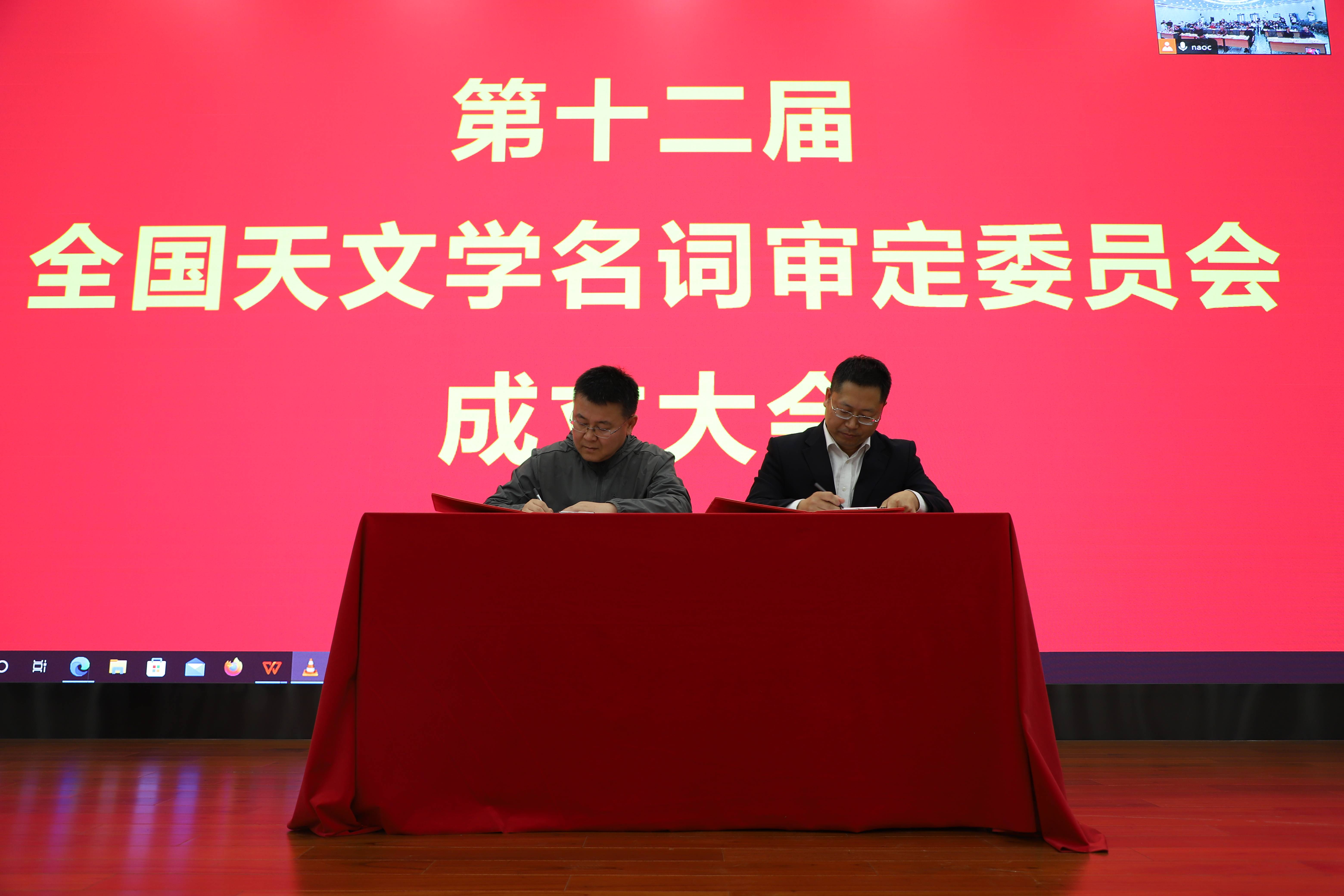 会上,全国科技名词委事务中心副主任张晖宣读了《关于同意开展天文学名词审定工作的复函》和《关于批准成立第十二届全国天文学名词审定委员会等机构的通知》。会议举行了第十二届全国天文学名词审定委员会秘书处共建协议签约仪式和授牌仪式。全国科技名词委专职副主任裴亚军与国家天文台副台长刘继峰在秘书处共建协议上签字。全国科技名词委事务中心副主任张晖将秘书处标牌授予国家天文台副台长赵公博。