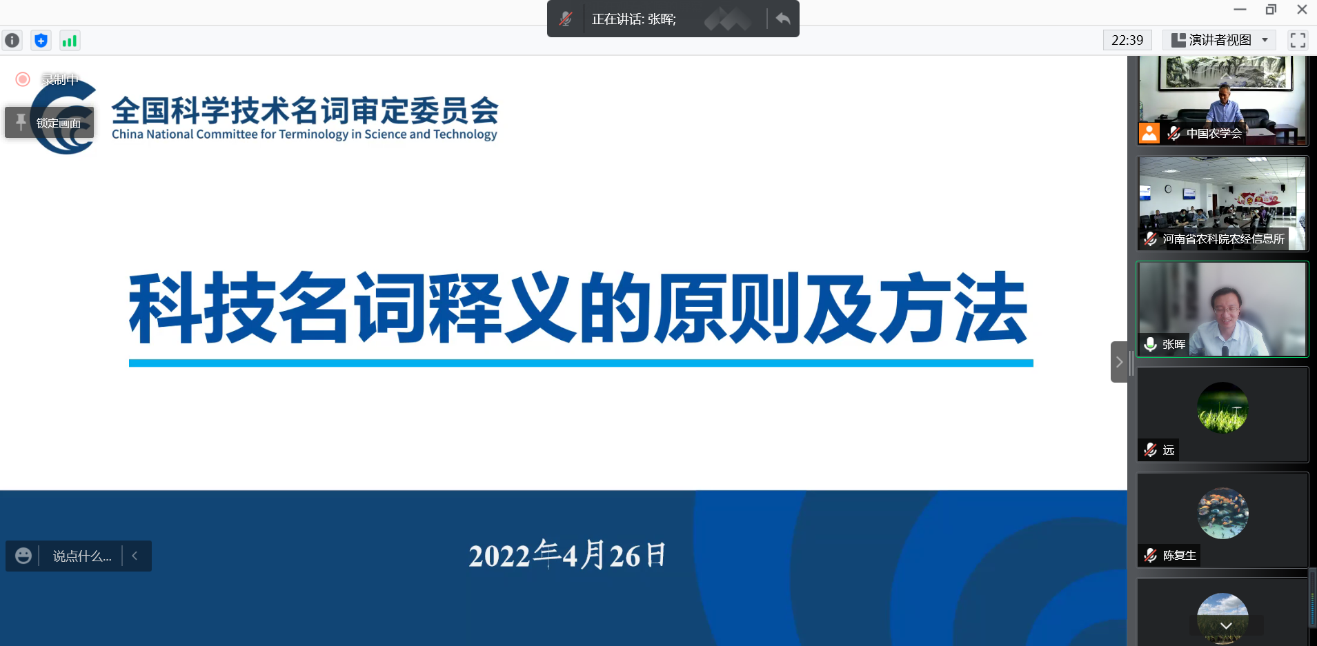 在专题讲解后,专家们进行了线上针对性的提问与交流。最后,莫广刚代表农学名词审定委员会要求各分支再次强化审定与专家专家队伍组织,按统一的名词版本开展释义工作,并对下一步工作的内容和时间节点做了明确要求和针对性部署。